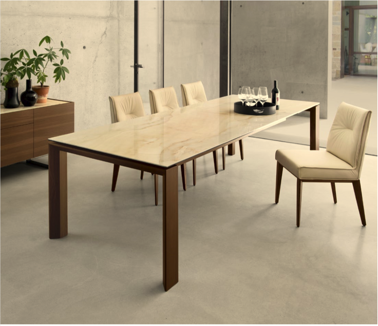 More than 200 customisation options: the Omnia is a chameleon of a table, elegant in all its finishes and able to accommodate up to 12 people thanks to its extremely simple extension system.